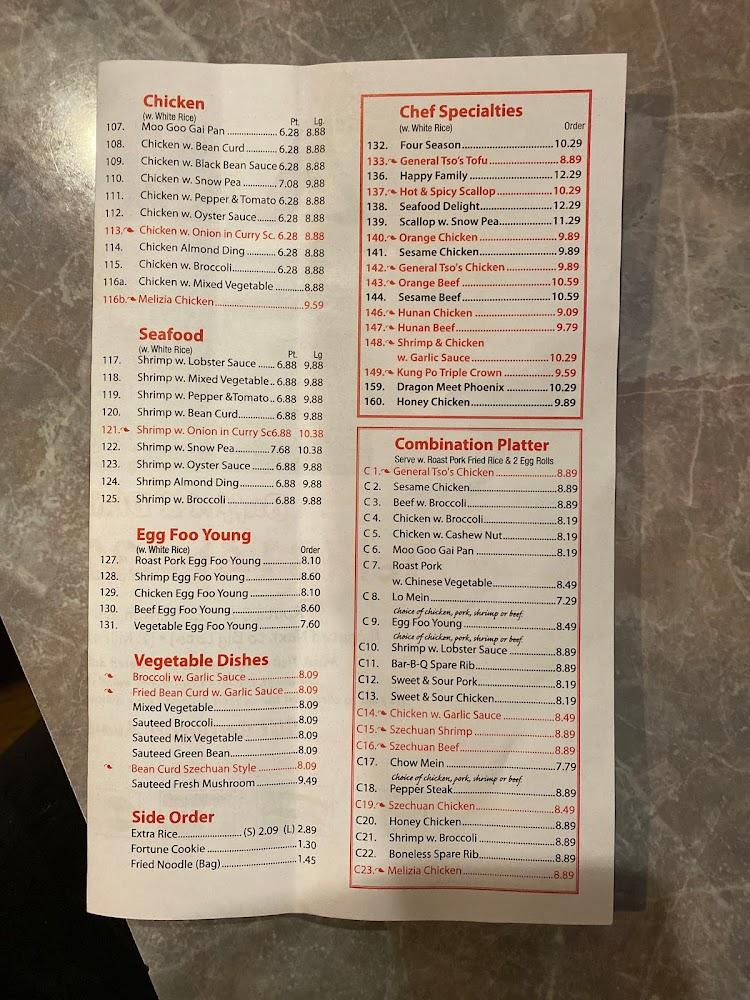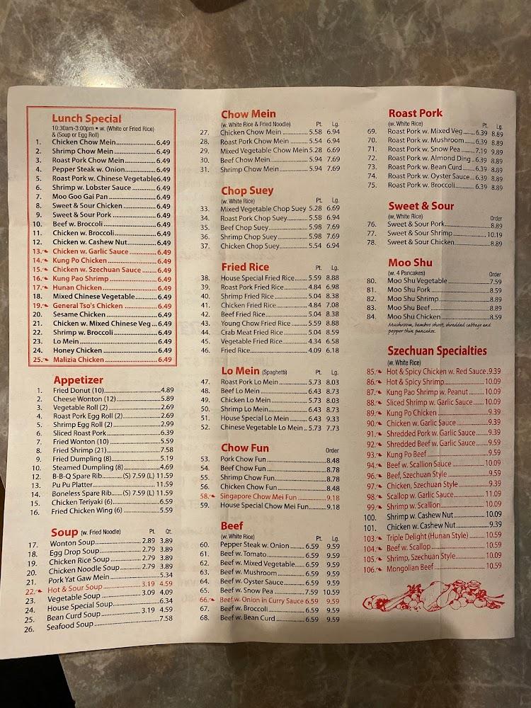 The menu features a broad array of Chinese cuisine. Offerings include a salad bar, appetizers, and main dishes like fried rice and chow mein. Diners can explore categories like Szechuan specialties and seafood delights. Notable dishes include Roast Pork Chow Mein and Moo Shu options. The dessert selection remains a sweet ending with favorite treats like fried donuts. Each dish aims to satisfy traditional palates. Whether dining solo or bringing the family, there's plenty to explore at A & C Buffet.
