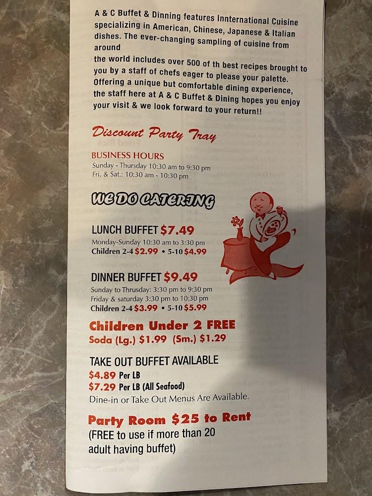 Welcome to A & C Buffet & Dinning, your premier destination for a delightful buffet experience in Franklin, PA. Open seven days a week, we offer a delectable lunch and dinner buffet alongside a full take-out menu, all prepared fresh from our kitchen. Our inviting atmosphere is perfect for families, groups, and friends, with accessible seating and facilities for all. Planning a gathering? Rent our spacious party room for just $25 or for free with 20 adult buffet diners. Discover great food, a salad bar, and a cozy setting at A & C Buffet & Dinning—where every meal is an event!